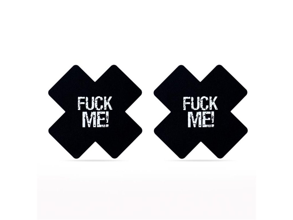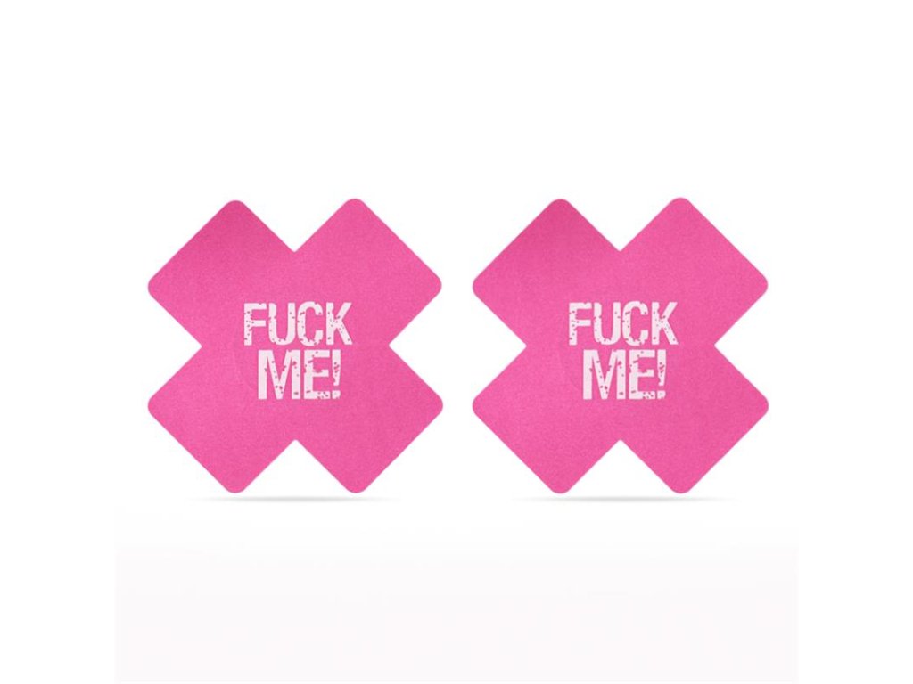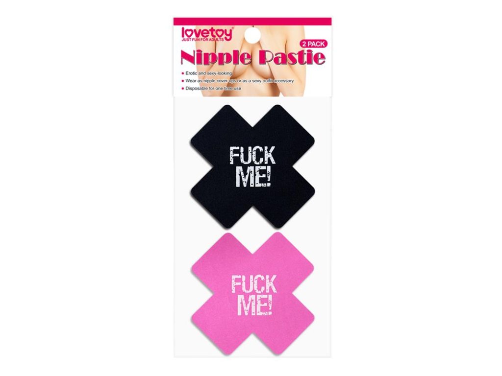 Odvážné kryty bradavek LOVETOY Fuck Me – křížový vzor s provokativním nápisem "FUCK ME" v černé a růžové barvě. Samolepicí, hypoalergenní, 2 páry v balení. Perfektní pro fetiš styl, intimní chvíle nebo jako dráždivý doplněk!